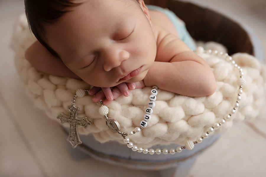 Entre os detalhes escolhidos para o ensaio, um deles trouxe ainda mais valor emocional às fotos: o terço que a mãe já havia usado no ensaio gestante.